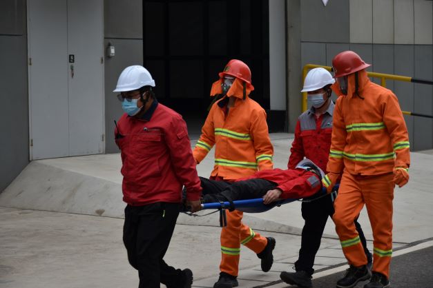 消防演練正式開始,李總宣布啟動(dòng)“環(huán)保消防應(yīng)急預(yù)案演習(xí)”,接到2#倉庫火情報(bào)警信息后,立即啟動(dòng)應(yīng)急預(yù)案,各小組按應(yīng)急預(yù)案快速投入滅火、救治等工作中。通訊與警戒組現(xiàn)場進(jìn)行調(diào)度、警戒,并對(duì)火災(zāi)現(xiàn)場進(jìn)行封鎖。醫(yī)療救護(hù)組對(duì)傷員進(jìn)行轉(zhuǎn)移、臨時(shí)急救。搶險(xiǎn)搶修組身著滅火服對(duì)著火點(diǎn)實(shí)施滅火。